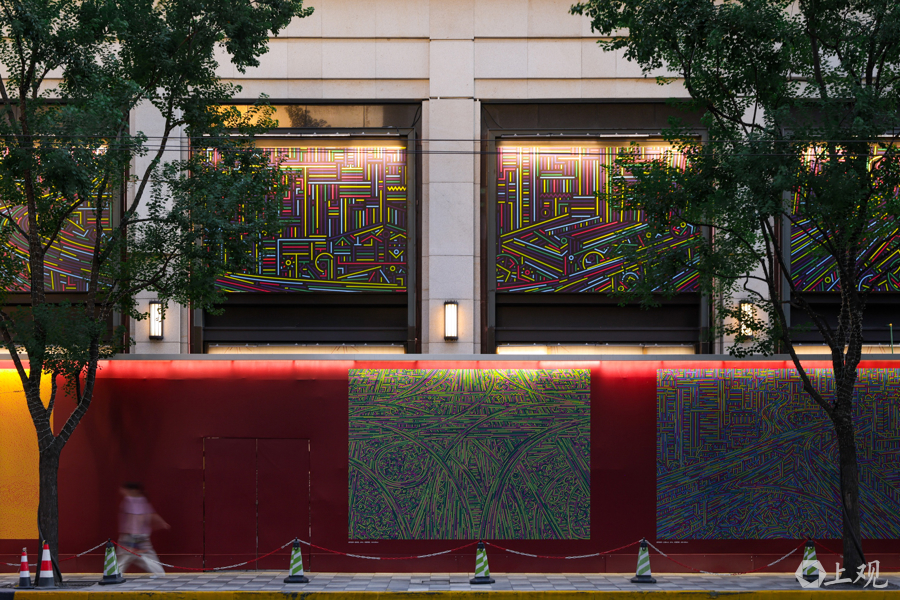 《城市经纬CITY STREAM》主题展墙,将石门一路、威海路沿街围挡转化为开放式艺术空间,艺术家陆新建的作品,以几何线条重构城市肌理,吸引路人驻足打卡。